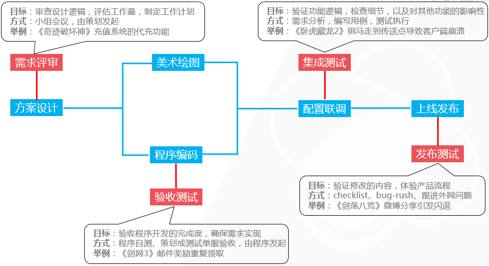配置联调。当程序编码已经完善了,美术资源也制作好了,策划的需求都基本得以实现了,这个时候还不能称之为完成,因为还没有将这些素材良好地组织起来。这就需要策划同学以配置表或配置文件的方式,将美术资源在游戏中安排好,比如什么场景里要放置什么NPC和怪物,还要填充大量的文本对话、说明文字和数值公式等。当策划完成所有的配置后,这个功能才算有了一个基础完整的可玩性了,然后就会通知到测试同学。功能测试中最重要也是工作量最大的工作内容要展开了:集成测试。