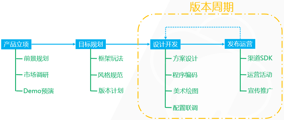 游戏也是软件的一种,所以简单来说,游戏开发跟传统软件开发流程是相似的,也都是遵循:设计→编码→测试→运营,之后进入更新维护阶段,重复上述流程。但展开来说,还是有很多细节内容值得介绍的。