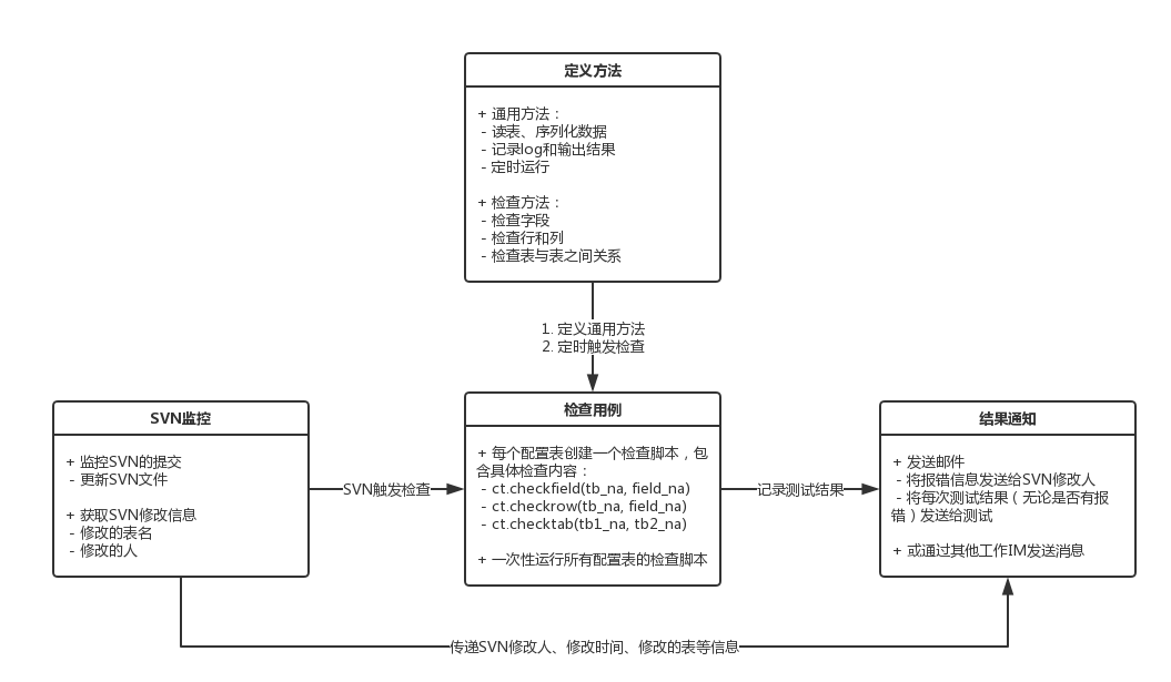 然后在这个基础上可以对CheckTable的功能进行扩展,比如定时自动运行,或是加入SVN(SVN是一种文件管理工具,主要用于团队多人协作。)监控,一有配置表修改就进行检查,如果发现报错还能将错误信息发送给对应的SVN提交人。扩展功能后的工具架构如下:
